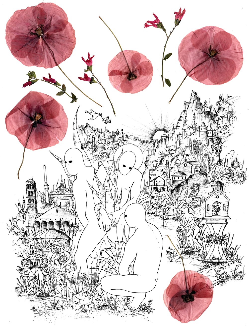 (Les fleurs collées sur le dessin sont des sauges à petites feuilles ramassées à Istres cet automne)