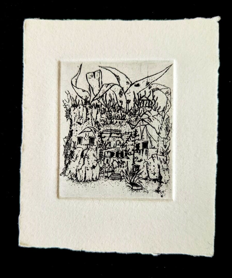 Gravure à l'eau eau-forte et marbrure, sur cuivre