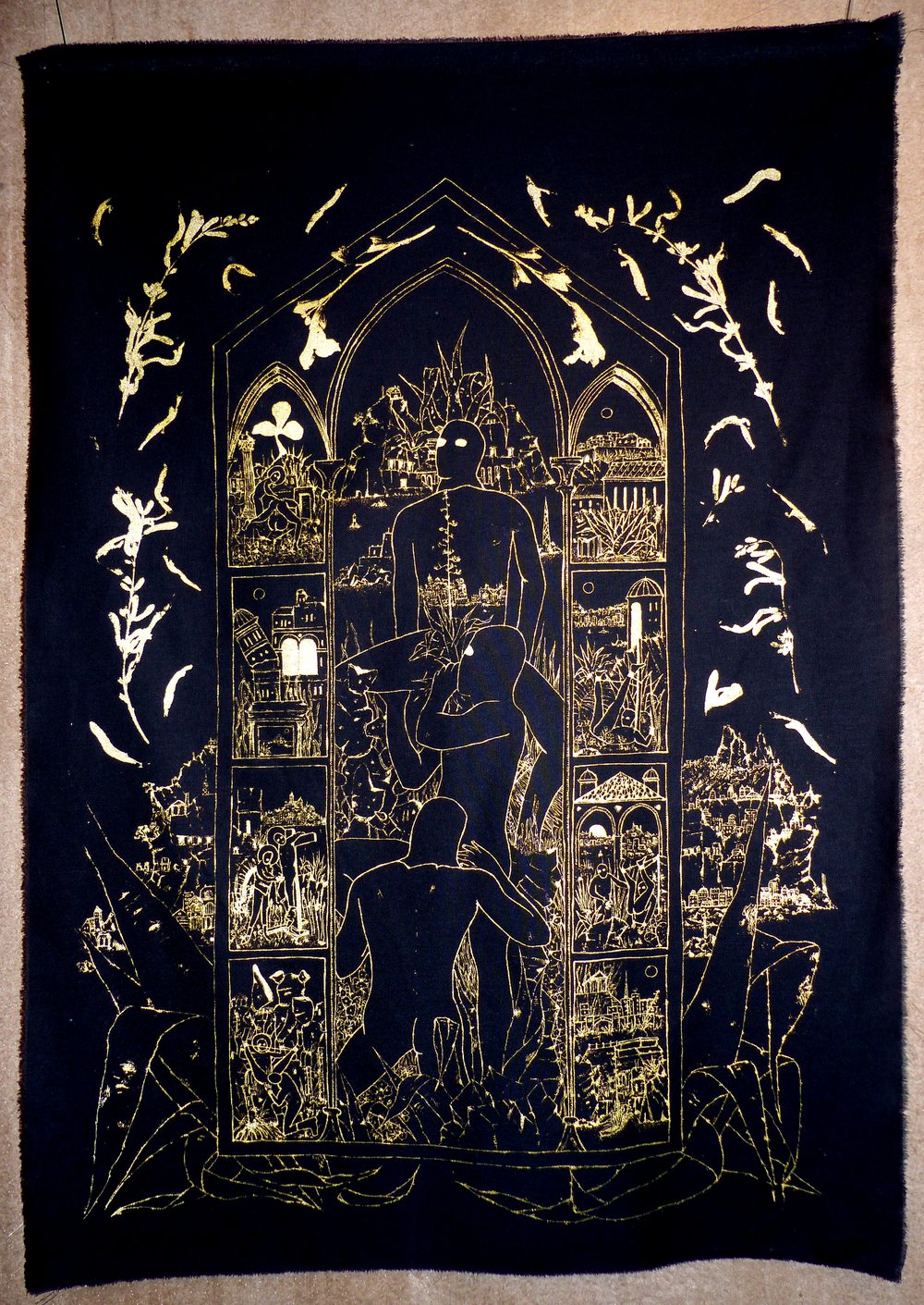 Sérigraphie sur tissus en coton moucheté. 85x65cm